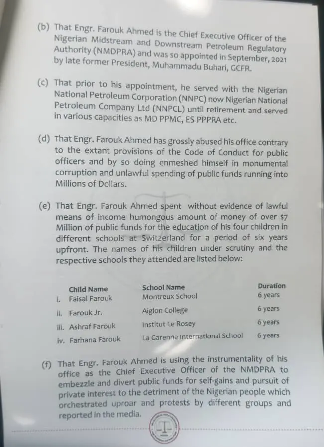 The billionaire businessman further alleged that Farouk used the instrumentality of the NMDPRA to embezzle and divert public funds for personal gain and private interests, actions he said had sparked recent protests and public outrage.