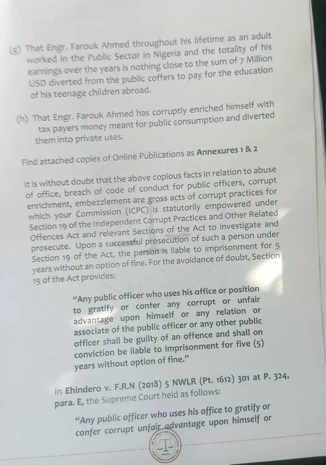 “It is without doubt that the above facts in relation to abuse of office, breach of the Code of Conduct for public officers, corrupt enrichment, and embezzlement constitute gross acts of corruption,” Dangote stated, noting that the ICPC is empowered under Section 19 of the ICPC Act to investigate and prosecute such offences.