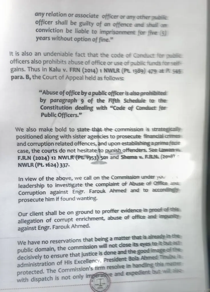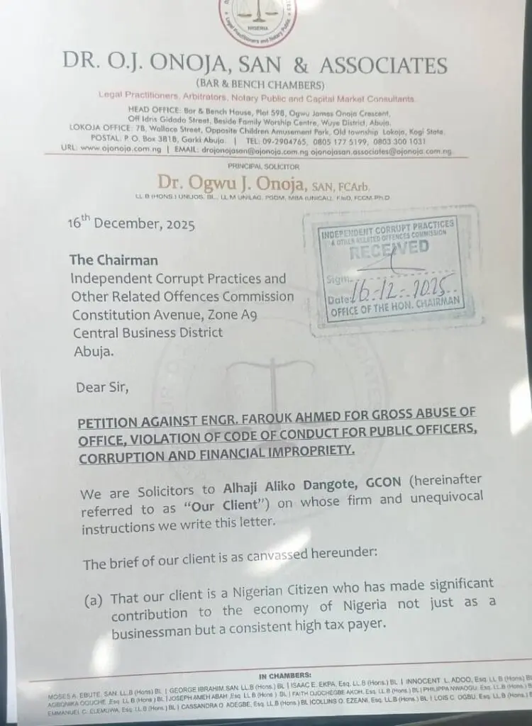 The petition, dated December 16 and submitted through Dangote’s lawyer, Ogwu Onoja (SAN), calls for the arrest, investigation, and prosecution of Farouk over allegations that he has lived far beyond his legitimate means as a public servant.